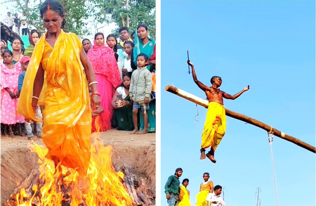 वहीं उनके पति सोमा गोप ने भी इस अवसर पर अपनी पीठ में लोहे का हुक घोंपकर लकड़ी से बने बल्ले पर लटकते हुए करीब 40 फीट ऊपर तक झूलकर भगवान शिव की आराधना की। यह दृश्य देखने के लिए आसपास के गांवों से बड़ी संख्या में श्रद्धालु पहुंचे थे। पूरे क्षेत्र में “हर-हर महादेव” के जयकारों से माहौल भक्तिमय हो गया।